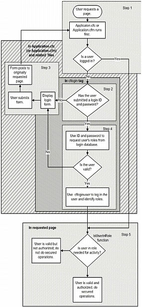 1. It checks the user's name against information it maintains about users and roles. In a simple case, the application might have two roles, one for users and one for administrators. The CFML assigns the Admin role to any user logged on with the user ID Admin and assigns the User role to all other users.