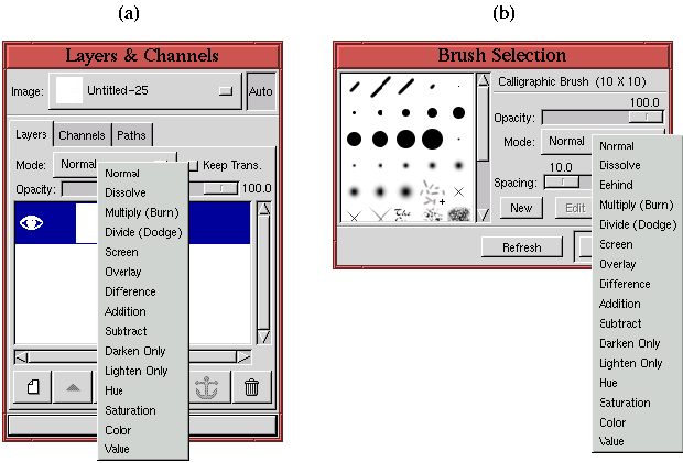The different blending modes are described in this section, and their practical uses and applications are described in the next. The GIMP has 16 different blending modes. They are listed in the following five logical groups: