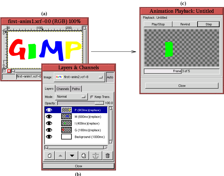 By default, GIMP animations sequentially present frames using the Combine mode. This means that as each new frame is displayed, it is stacked on the previous one. Thus, if a new frame is partially transparent the previous frame can be seen through its transparent parts. This is not the traditional movie paradigm for animation, which, instead of combining frames, replaces each frame with a new one. Consequently, although the frames in Figure 9.1 all consist of single letters on a transparent field, the animation spells out the word GIMP a letter at a time on the white background of the first layer.